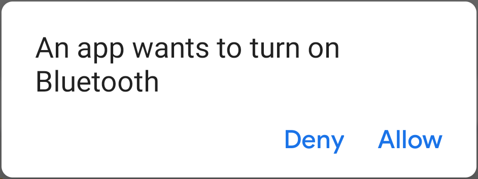 아래와 같이 블루투스를 사용 설정하기 위해 사용자 권한을 요청하는 대화상자가 나타납니다. 그림 1. 사용자가 권한을 부여하면 시스템이 Bluetooth를 활성화하기 시작합니다. 프로세스가 완료되거나 실패하면 포커스가 앱으로 반환됩니다.