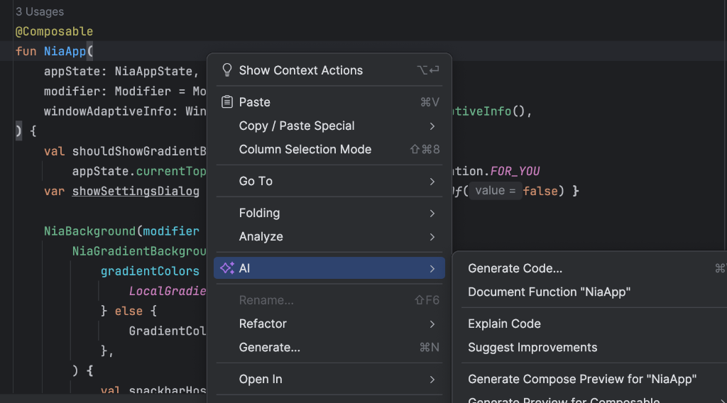 Android Studio'daki yapay zeka aracısı, composable'larınız için otomatik olarak Compose önizlemeleri oluşturabilir. Bir Composable işlevini sağ tıklayın ve Yapay Zeka > [Composable adı]için Önizleme Oluştur'u seçin. Aracı, composable'ınızı analiz ederek gerekli @Preview doğru parametrelerle standart metni oluşturur ve kullanıcı arayüzünüzün beklendiği gibi oluşturulduğunu hızlıca doğrulamanıza yardımcı olur.