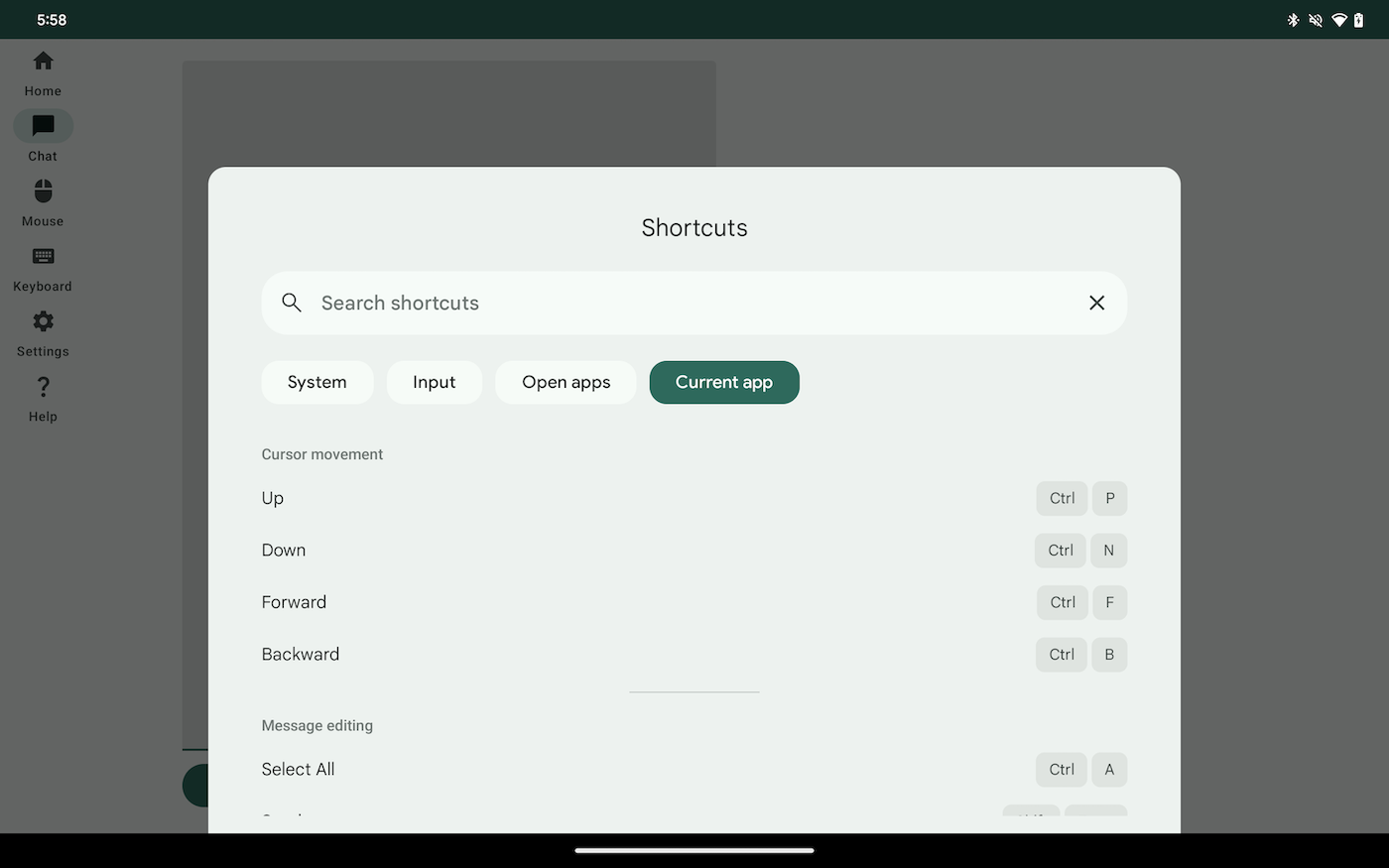 כלי העזרה למקשי קיצור מציג מקשי קיצור בקבוצות נפרדות כדי שהמשתמשים יוכלו למצוא קיצורי דרך לפי תרחיש לדוגמה, או למסכים של באפליקציה שלך. איור 2 מציג את מקשי הקיצור הנתונים מחולקים לשתי קבוצות: תנועת הסמן ועריכת הודעות.