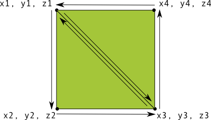 মনে রাখবেন যে এই আকৃতির স্থানাঙ্কগুলি ঘড়ির কাঁটার বিপরীত ক্রমে সংজ্ঞায়িত করা হয়েছে। অঙ্কন ক্রম গুরুত্বপূর্ণ কারণ এটি সংজ্ঞায়িত করে যে আকৃতির সামনের মুখ কোনটি, যা আপনি সাধারণত আঁকতে চান এবং পিছনের মুখ, যা আপনি OpenGL ES কুল ফেস বৈশিষ্ট্য ব্যবহার করে আঁকতে না বেছে নিতে পারেন৷ ফেস এবং কুলিং সম্পর্কে আরও তথ্যের জন্য, OpenGL ES ডেভেলপার গাইড দেখুন।