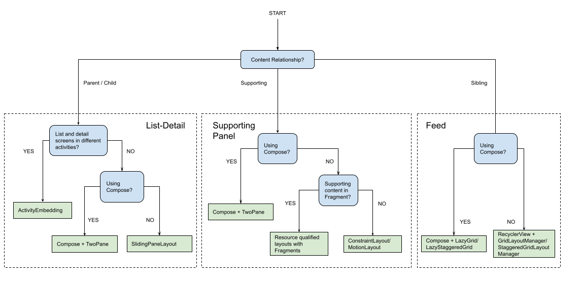 เลย์เอาต์ตามรูปแบบบัญญัติสร้างการนำเสนอเนื้อหาหลากหลายรูปแบบเพื่อให้เข้าถึงได้ง่ายและเจาะลึก ใช้โฟลว์ชาร์ตต่อไปนี้เพื่อกำหนดเลย์เอาต์และกลยุทธ์การใช้งานที่เหมาะกับกรณีการใช้งานของแอปมากที่สุด