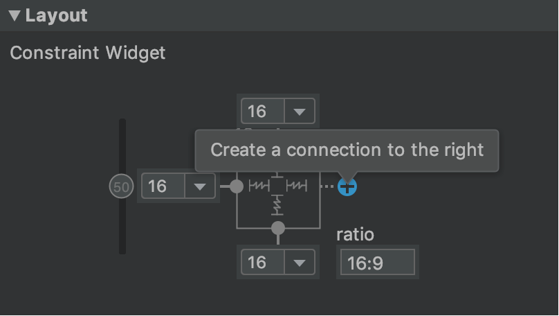 Vous pouvez définir la taille de la vue sur un format, tel que 16:9, si au moins l'une des dimensions de la vue est définie sur "Concordance avec les contraintes" (0dp). Pour activer le format, cliquez sur Activer/Désactiver la contrainte de format (appel de la figure 14 : 1) et saisissez le format width:height dans le champ de saisie qui s'affiche.