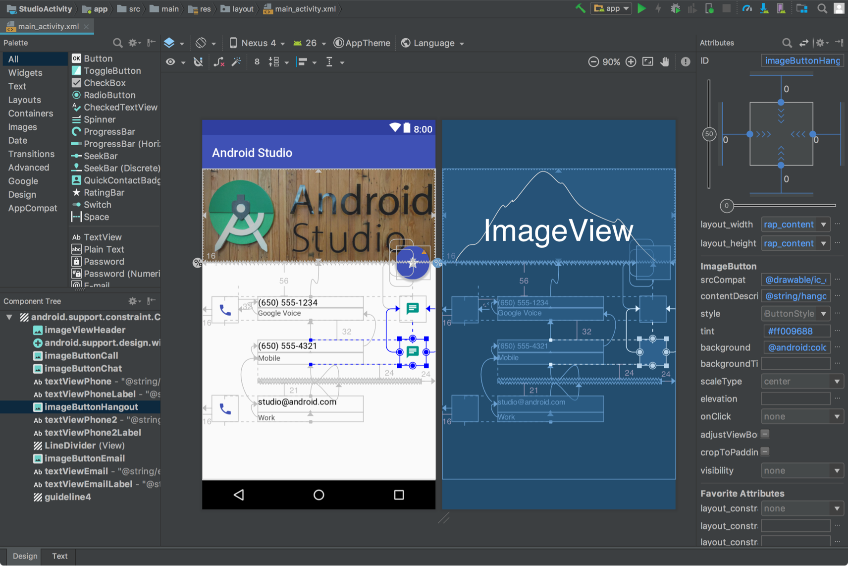 The easiest way to build a layout with ConstraintLayout is to use the Layout Editor in Android Studio. Layout Editor enables you to drag new views to the layout, apply constraints relative to parent and sibling views, and set view properties—all without editing any XML by hand.