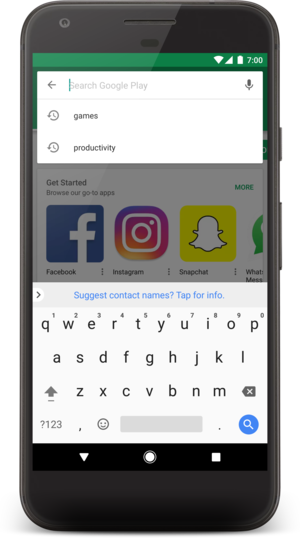 - Jeśli użytkownik przeprowadzi wyszukiwanie, sugestie zostaną zignorowane, a wyszukiwanie zostanie przekazane do Twojej aktywności z możliwością wyszukiwania za pomocą zwykłego intencji