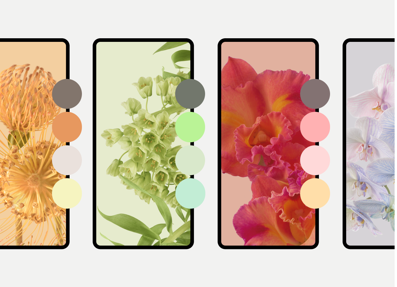 کاربران میتوانند از اندروید ۱۲ به بعد، انواع رنگها را از بین رنگهای استخراجشده از تصویر زمینه و تمهای مختلف انتخاب کنند و در اندروید ۱۳، انواع بیشتری به آن اضافه شده است. به عنوان مثال، کاربری که گوشی پیکسل او اندروید ۱۳ را اجرا میکند، میتواند از تنظیمات تصویر زمینه و سبک ، همانطور که در شکل ۴ نشان داده شده است، یک نوع رنگ را انتخاب کند.