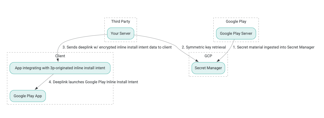 - Serwery Google Play generują klucze szyfrowania Authenticated Encryption with Associated Data (AEAD) i przesyłają je do instancji Google Cloud Platform (GCP) Secret Manager.