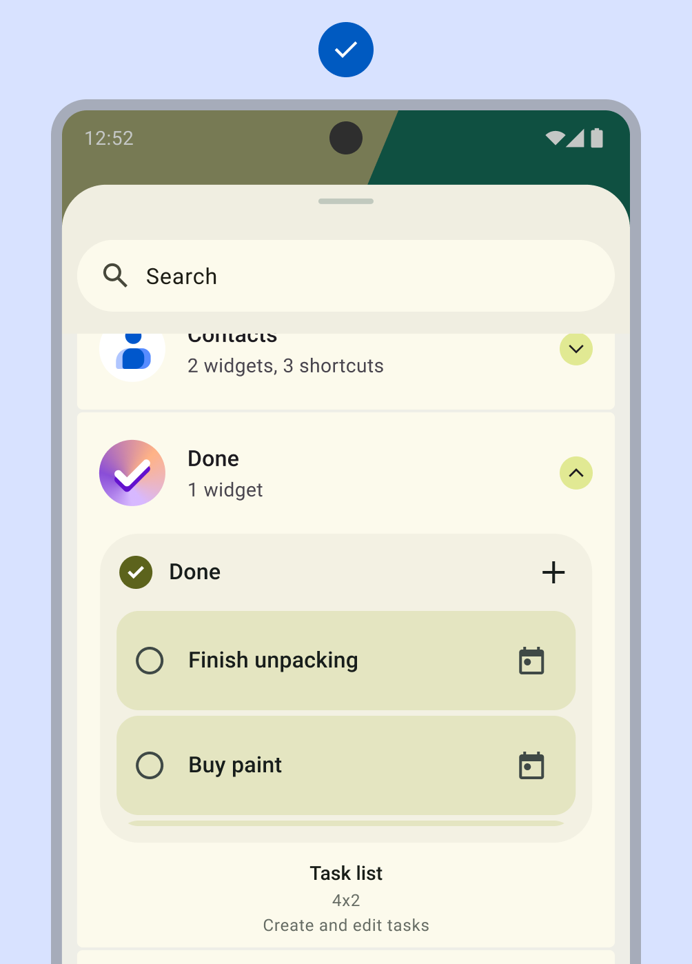 Diese Widgets unterstützen Premium-Startbildschirmanpassungen und werden Nutzern empfohlen und Entwicklern als Best Practice präsentiert. Differenzierte Widgets bieten eine hervorragende Nutzererfahrung und werden von Android genutzt, um das Ökosystem zu inspirieren und zu beleben. Sie erfüllen alle differenzierten Kriterien für Layout, Farbe, Entdeckung und Inhalt.