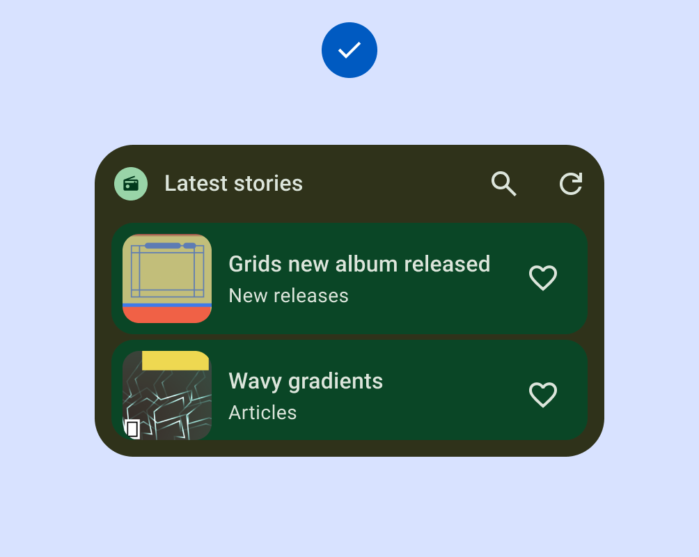 วิดเจ็ตเหล่านี้รองรับการปรับแต่งหน้าจอหลักระดับพรีเมียม และจะแนะนำให้กับผู้ใช้และแสดงให้นักพัฒนาแอปเห็นเพื่อเป็นแนวทางปฏิบัติแนะนำ วิดเจ็ตที่แตกต่างจะมอบประสบการณ์การใช้งานที่โดดเด่น และ Android ใช้ประโยชน์จากวิดเจ็ตเหล่านี้เพื่อสร้างแรงบันดาลใจและกระตุ้นระบบนิเวศ วิดีโอเหล่านี้เป็นไปตามเกณฑ์ด้านเลย์เอาต์ สี การค้นพบ และเนื้อหาที่แตกต่างทั้งหมด