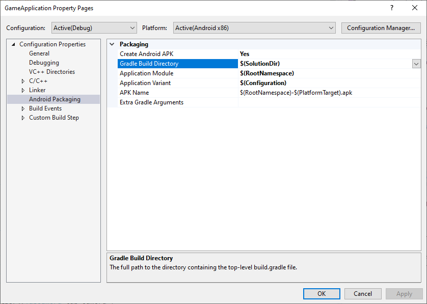 settings.gradle. Jest on zwykle nazywanyappw przypadku projektów utworzonych bezpośrednio w Android Studio. - Wariant aplikacji: wariant na Androida, który ma zostać utworzony. Wartość tę należy ustawić zgodnie z konfiguracjami MSBuild. Na przykład kompilacja debugowania powinna mieć wartość ustawioną na wariant debugowania. Jeśli nazwa konfiguracji MSBuild Twojego projektu jest zgodna z nazwami wariantów Gradle, użyj domyślnej wartości