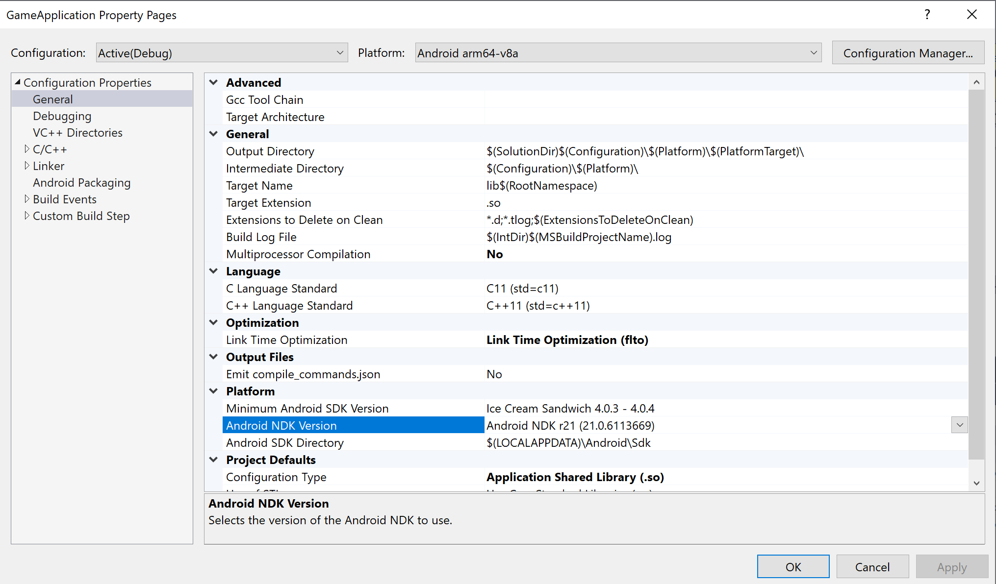 AGDE używa wybranego przez Ciebie NDK, aby określić domyślne opcje kompilacji i linkowania podczas kompilowania części aplikacji napisanej w C/C++.