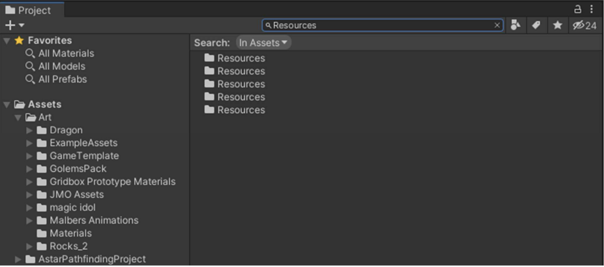 Чтобы быстро найти все папки с ресурсами, найдите раздел «Ресурсы» на панели «Проект» . Затем выберите каждую папку, чтобы узнать её содержимое и определить, нужна ли она для вашей игры.