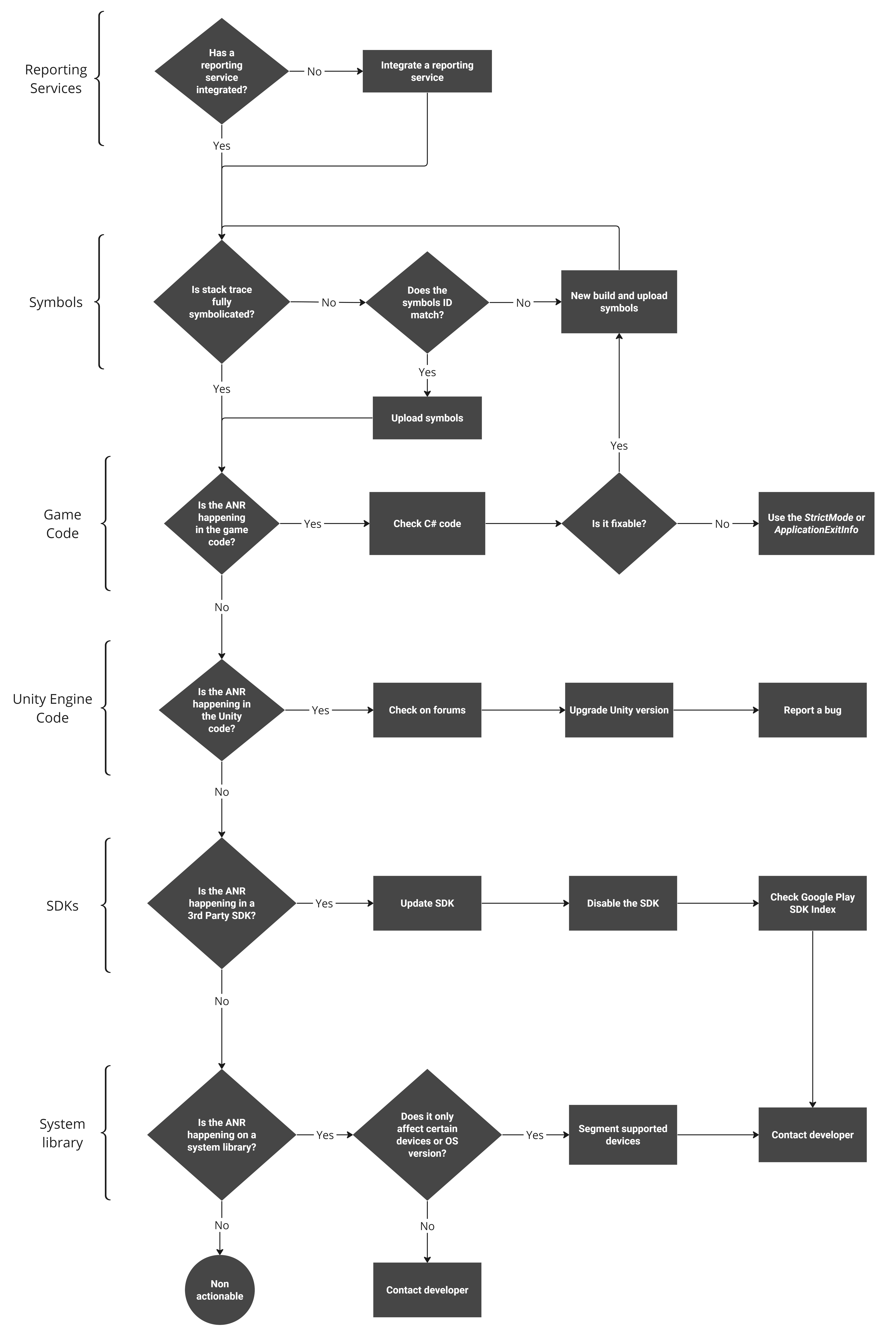 حلِّل التقارير من خدمة إعداد التقارير وتحقّق مما إذا كانت عمليات تتبُّع تسلسل استدعاء الدوال البرمجية بتنسيق يمكن قراءته. لمزيد من المعلومات، اطّلِع على مقالة تحويل رموز أخطاء ANR والأعطال في ألعاب Unity على Android إلى رموز مفهومة.