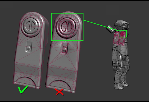 Không lập mô hình các chi tiết bằng nhiều tam giác. Sử dụng hoạ tiết và bản đồ pháp tuyến cho loại chi tiết nhỏ này. Bạn có thể hợp nhất các đỉnh và các chi tiết tam giác quá nhỏ, không góp phần tạo nên hình ảnh hoàn thiện.