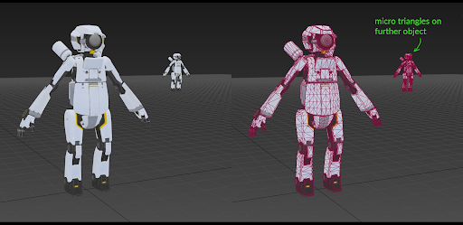 Trong Hình 9, rô-bốt ở nền trước không có tam giác vi mô. Rô-bốt ở nền sau có tam giác vi mô vì mỗi tam giác chỉ có kích thước từ 1 đến 10 pixel.