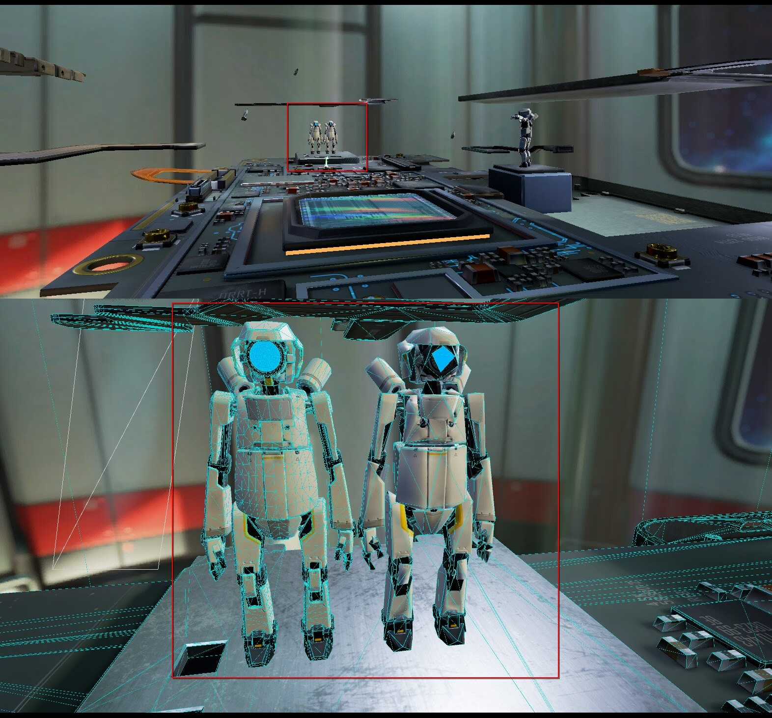 以下示例展示了不同演示中的两个模型。Circuit VR 演示只有一个机器人角色。由于只有一个对象,因此该机器人模型的三角形数量较多。另一个模型来自 Armies 演示。该演示的每一帧中都有数百名士兵,因此每个士兵的三角形数量较少。
