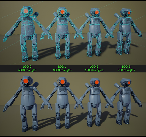我们建议您尽可能使用 LOD。将重点放在对象的轮廓上。最好将重点放在对象的平坦部位上,以便减少顶点。下图显示了将 LOD 应用于机器人模型的使用情况。