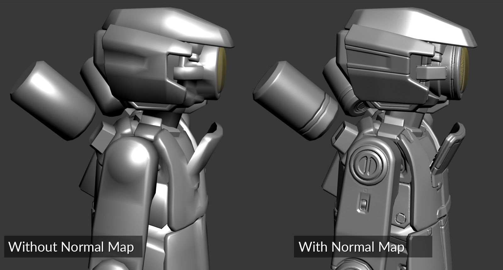 图 8. 这是使用法线贴图和不使用法线贴图的模型的对比图。