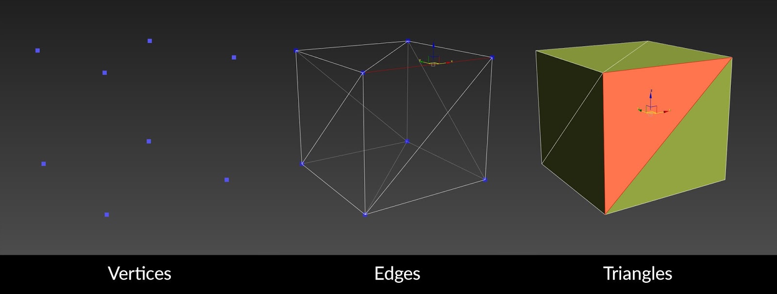 三角形:通过三条边将三个顶点两两连接就构成了一个三角形。其有时称为多边形或面。在 3ds Max、Maya 或 Blender 等 3D 软件中,通常使用的是四边形。四边形是具有四条边的多边形,更易于修改和使用。在渲染时,这些多边形在屏幕上显示为三角形。