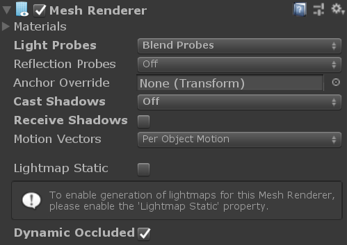 Turn off anything you don’t use. Settings like Cast Shadows add cost when you render the Scene even if the object isn't lit. The following example of the Mesh Renderer settings is for a character shown in Figure 13. The character uses light probe data, but not reflection probes.