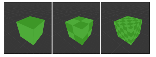 চিত্র 8. প্রথম কিউবের একটি লাইটম্যাপ রেজোলিউশন 1 আছে। দ্বিতীয় ঘনক্ষেত্রটির একটি লাইটম্যাপ রেজোলিউশন 2 রয়েছে। তৃতীয় ঘনকটির একটি লাইটম্যাপ রেজোলিউশন 5 রয়েছে।