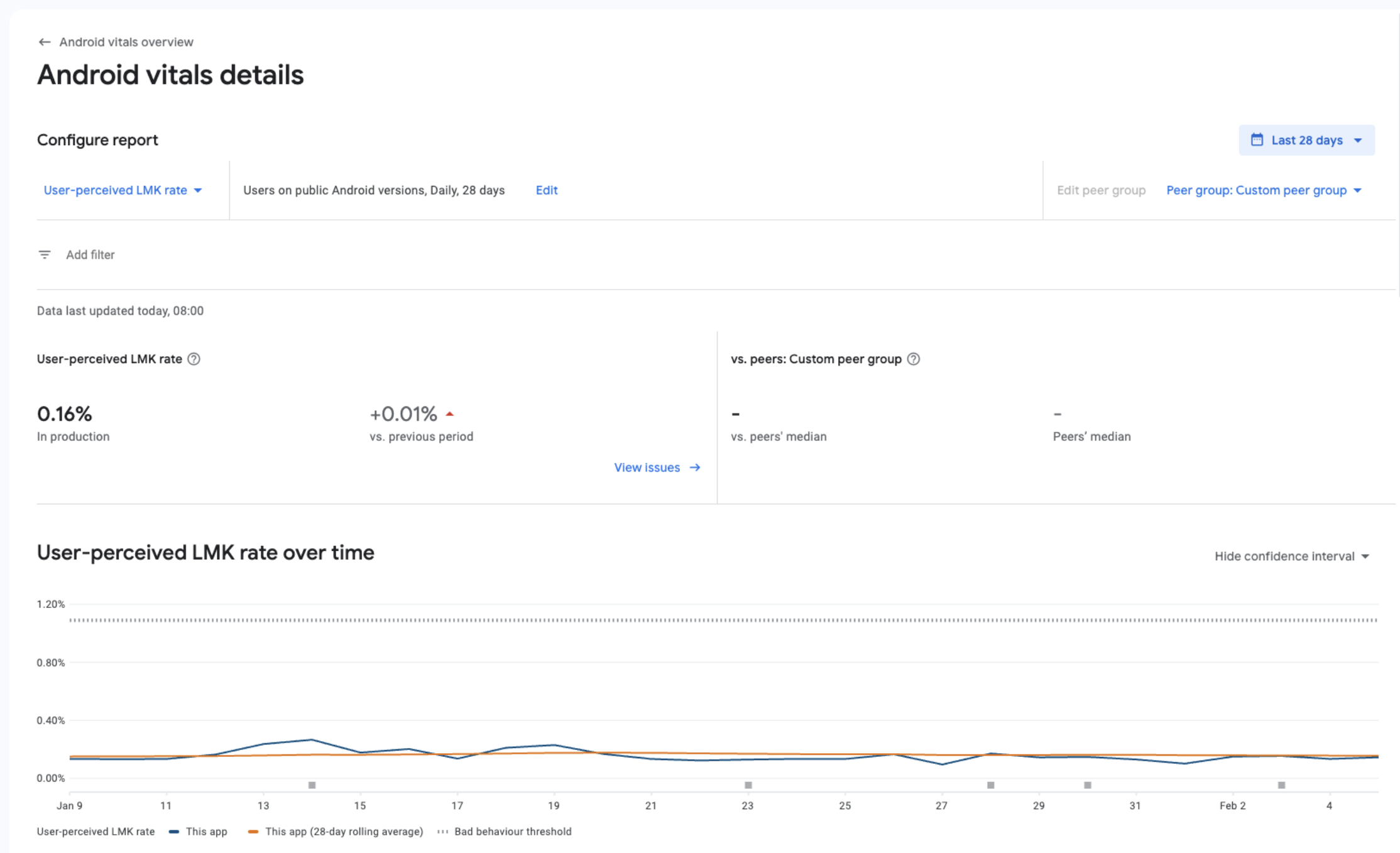 Assim como outras métricas vitais, como ANRs e falhas, é possível filtrar as métricas, comparar com seus pares ou monitorar a mudança da métrica por um longo período (até três anos). Os dados estão disponíveis para apps existentes a partir de 28 de janeiro de 2025.