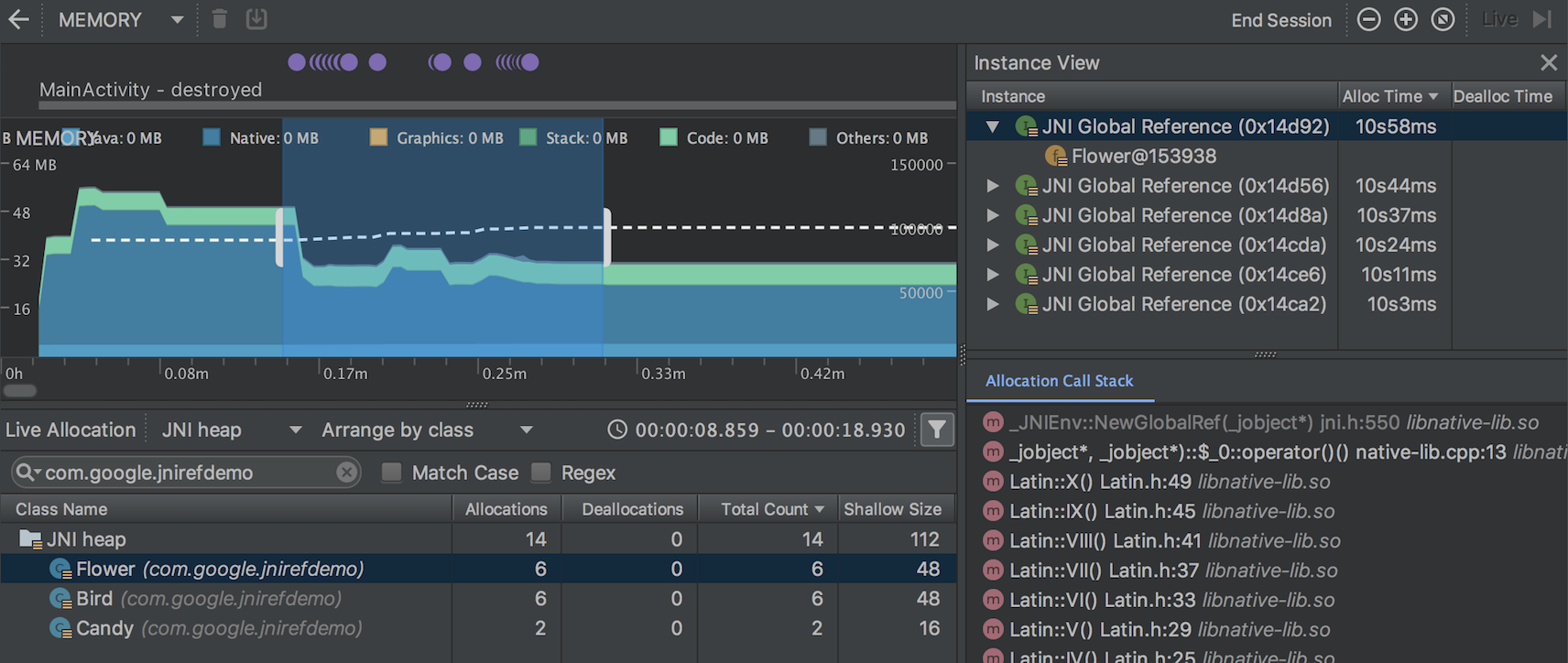 • Uygulamanızın bellek ayırmalarını kaydedin, ayrılan tüm nesneleri inceleyin ve her ayırma için yığın izlemeyi görüntüleyin.