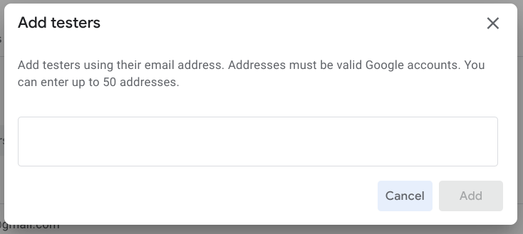 - Pada dialog yang muncul, masukkan alamat email Akun Google yang ingin Anda tambahkan sebagai penguji (dipisahkan dengan koma atau satu alamat email per baris).