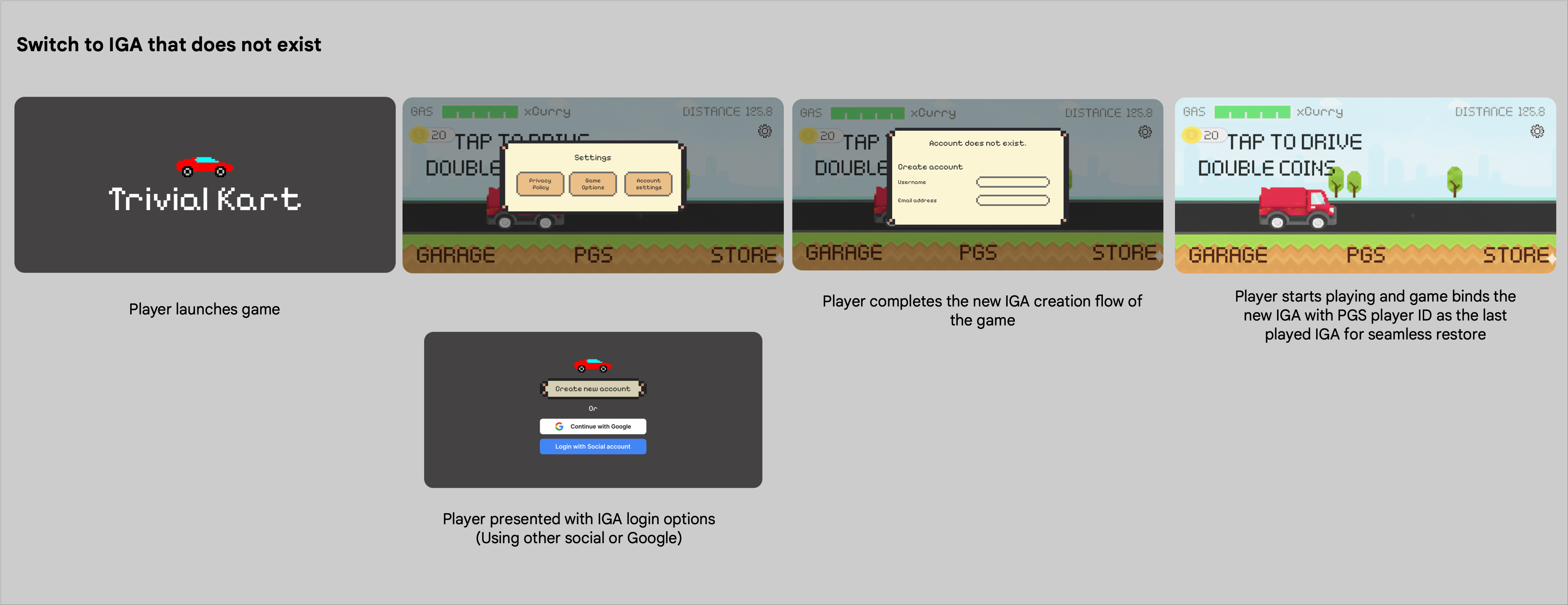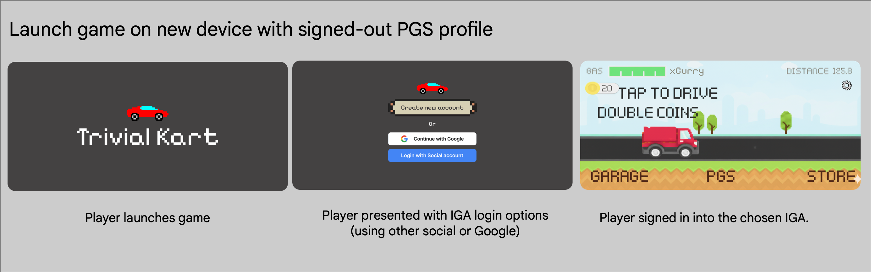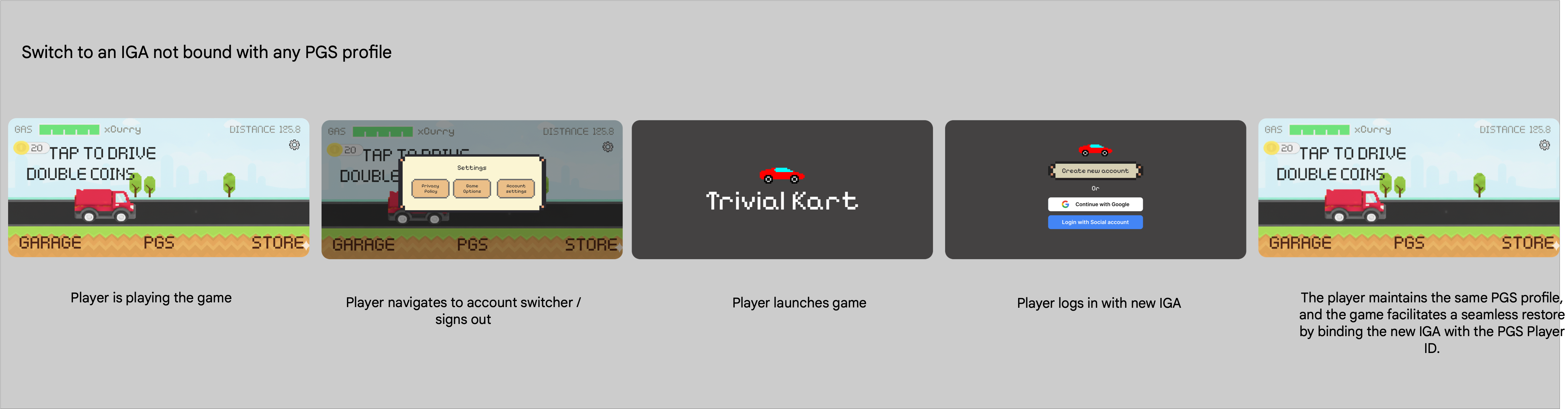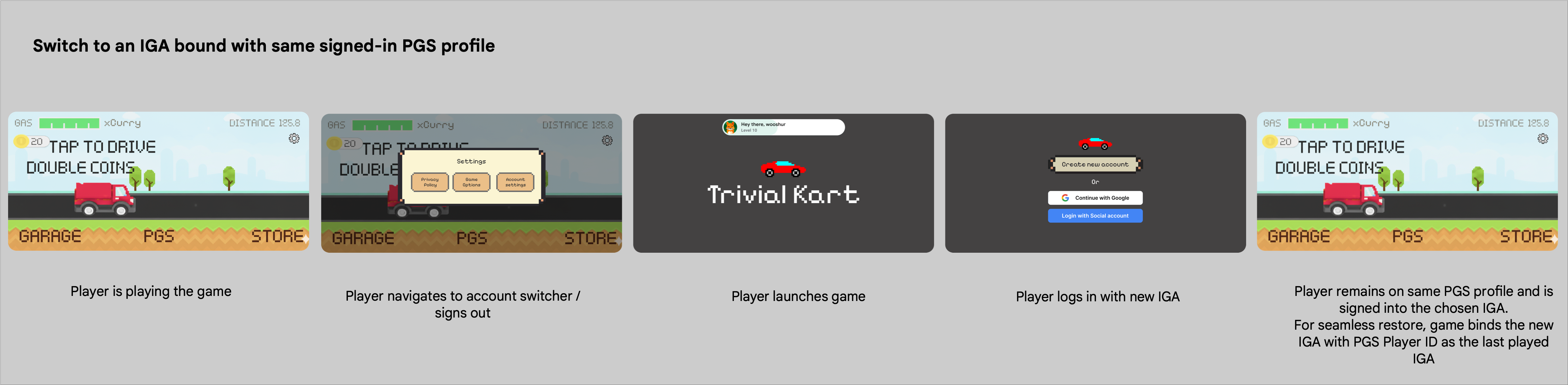 - وقتی بازیکن با یک حساب کاربری IGA متفاوت وارد سیستم میشود، بازی این حساب جدید را به عنوان آخرین حساب کاربری IGA بازی شده به PGS Player ID فعلی متصل میکند تا بازیابی بدون مشکل انجام شود.