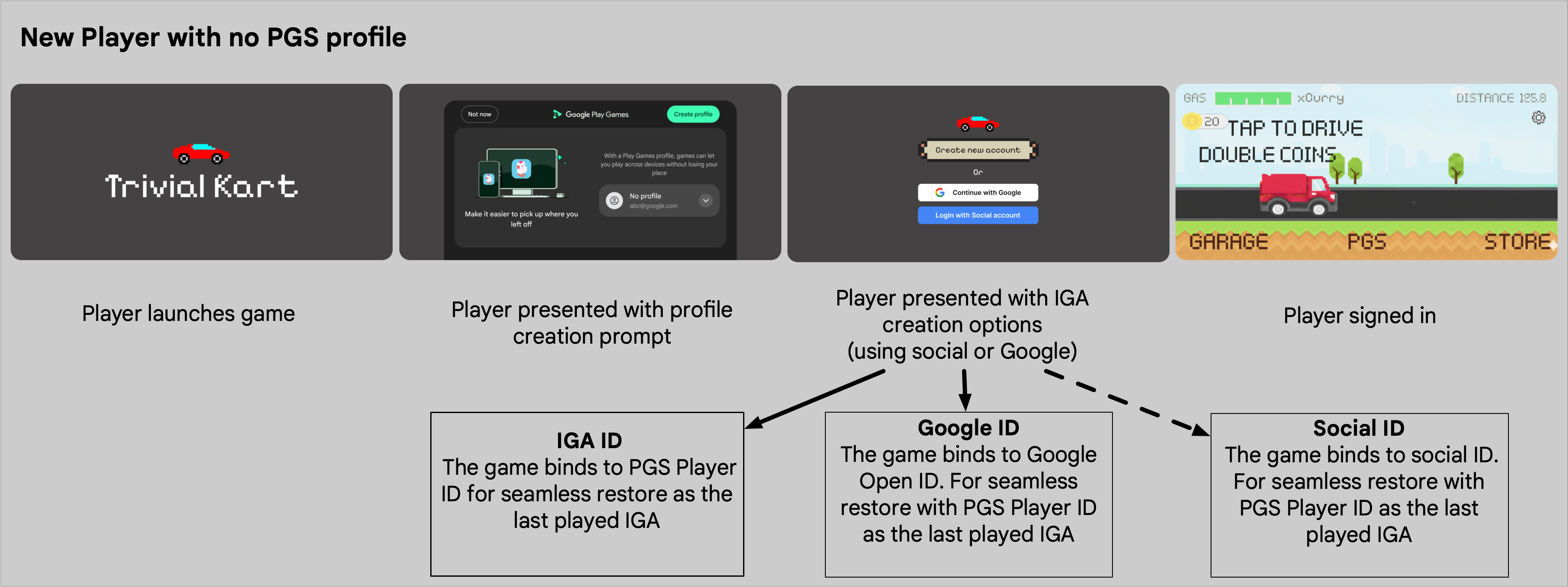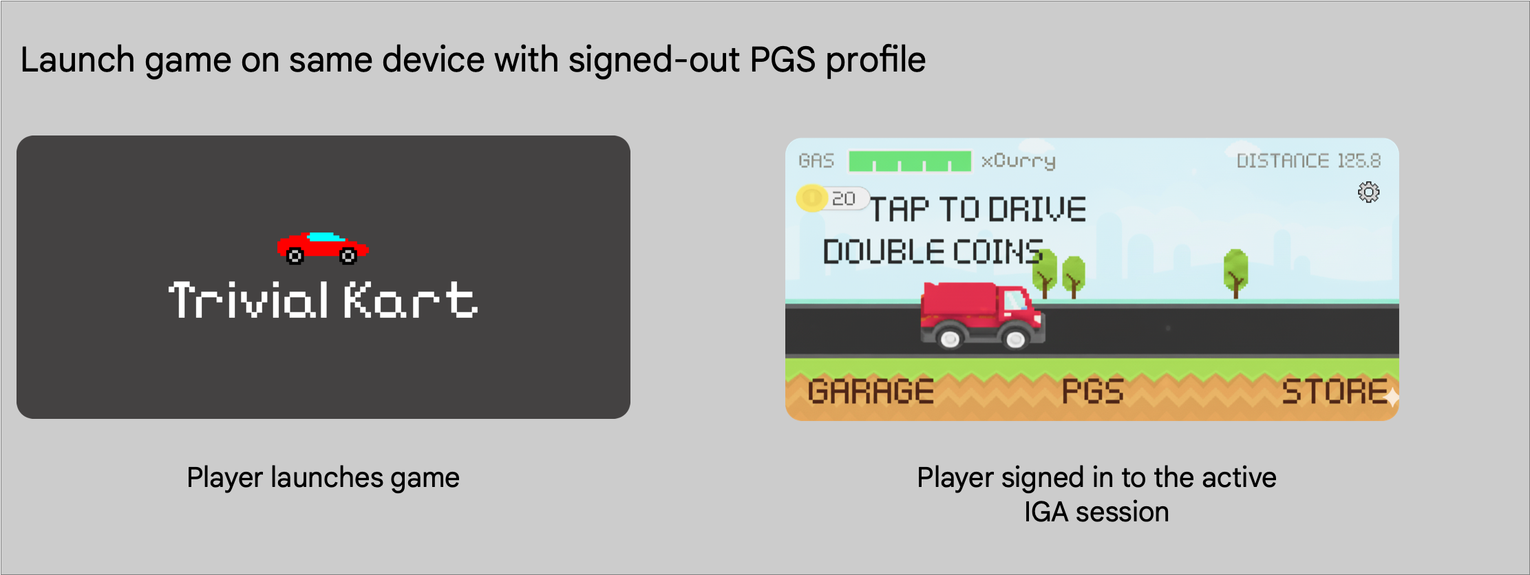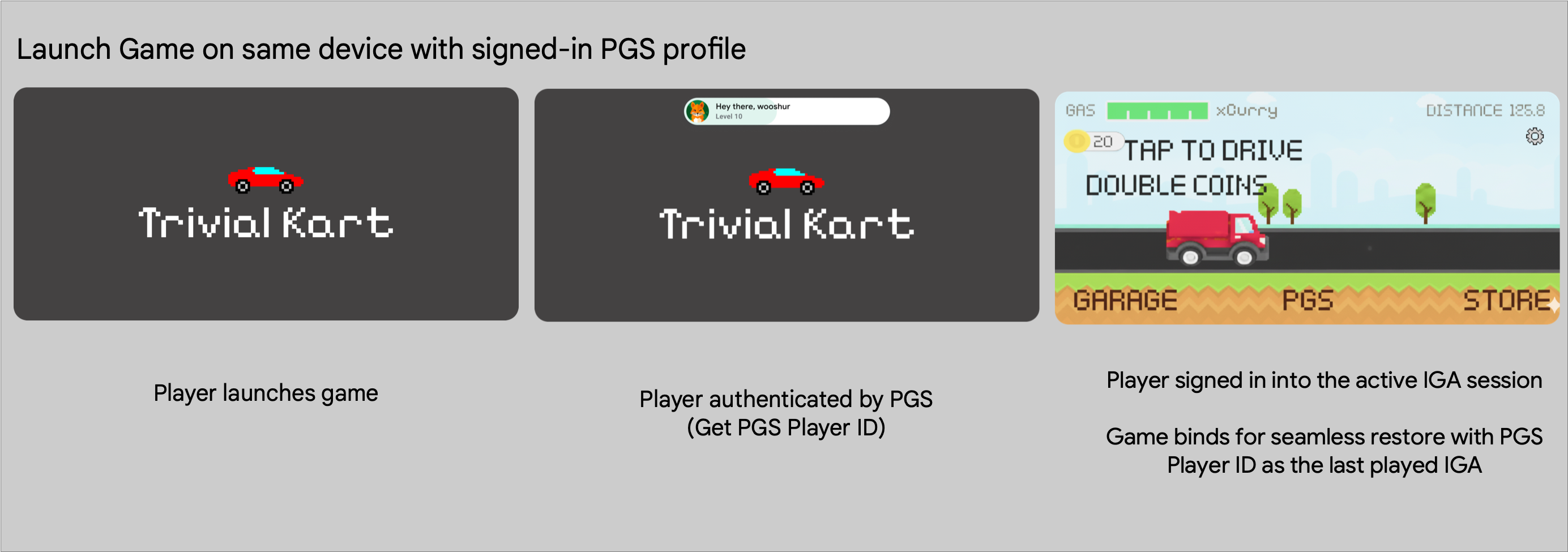 - وقتی بازیکن با یک حساب کاربری IGA متفاوت وارد سیستم میشود، بازی این حساب جدید را به عنوان آخرین حساب کاربری IGA بازی شده به PGS Player ID فعلی متصل میکند تا بازیابی بدون مشکل انجام شود.