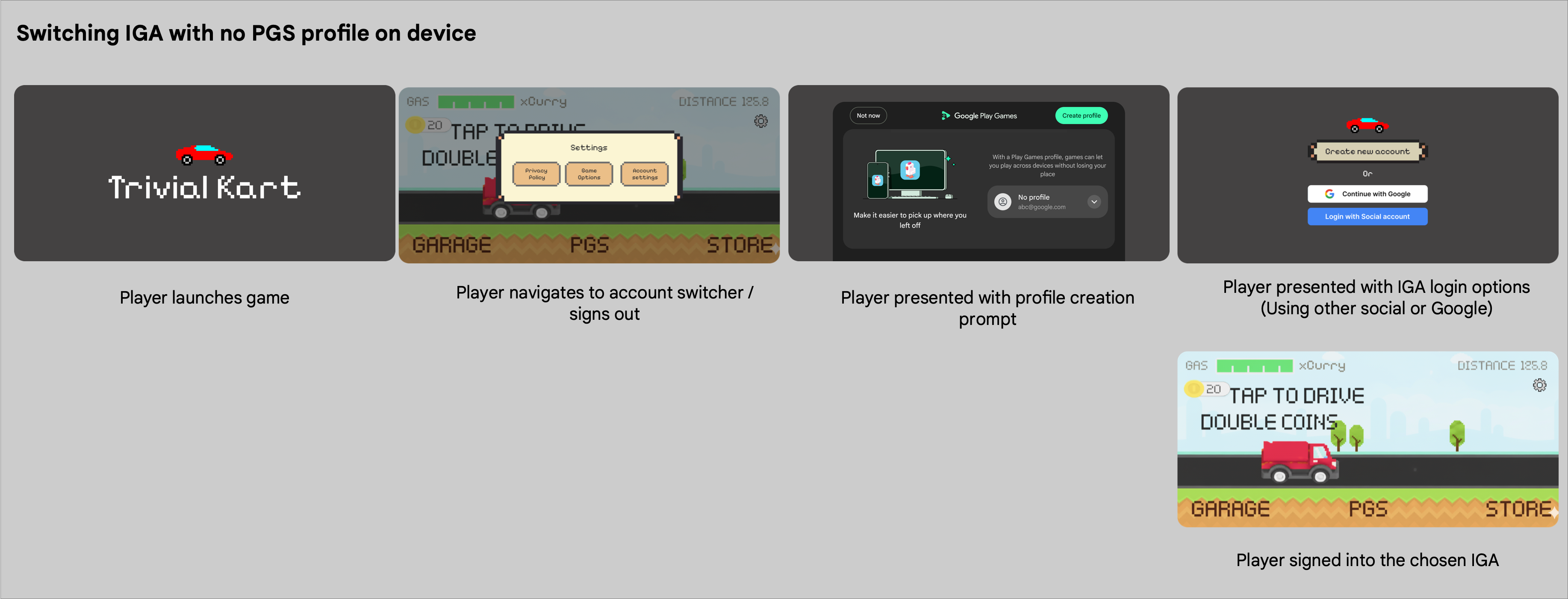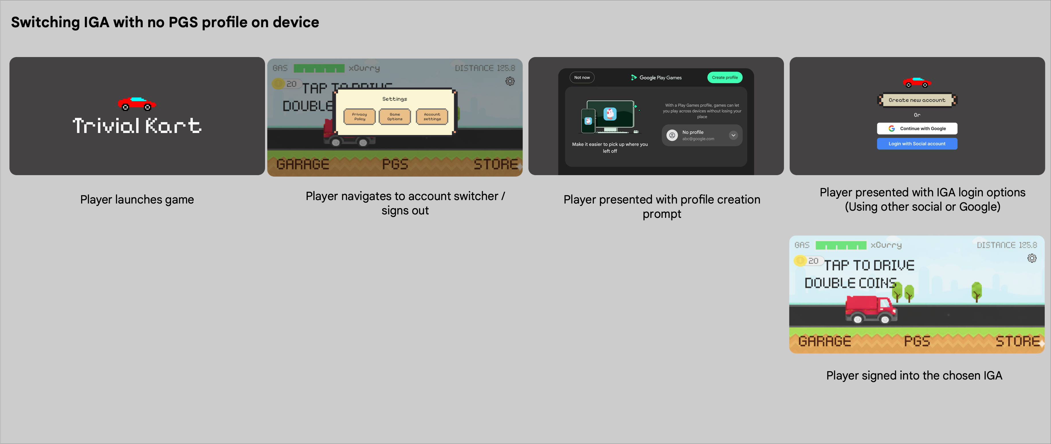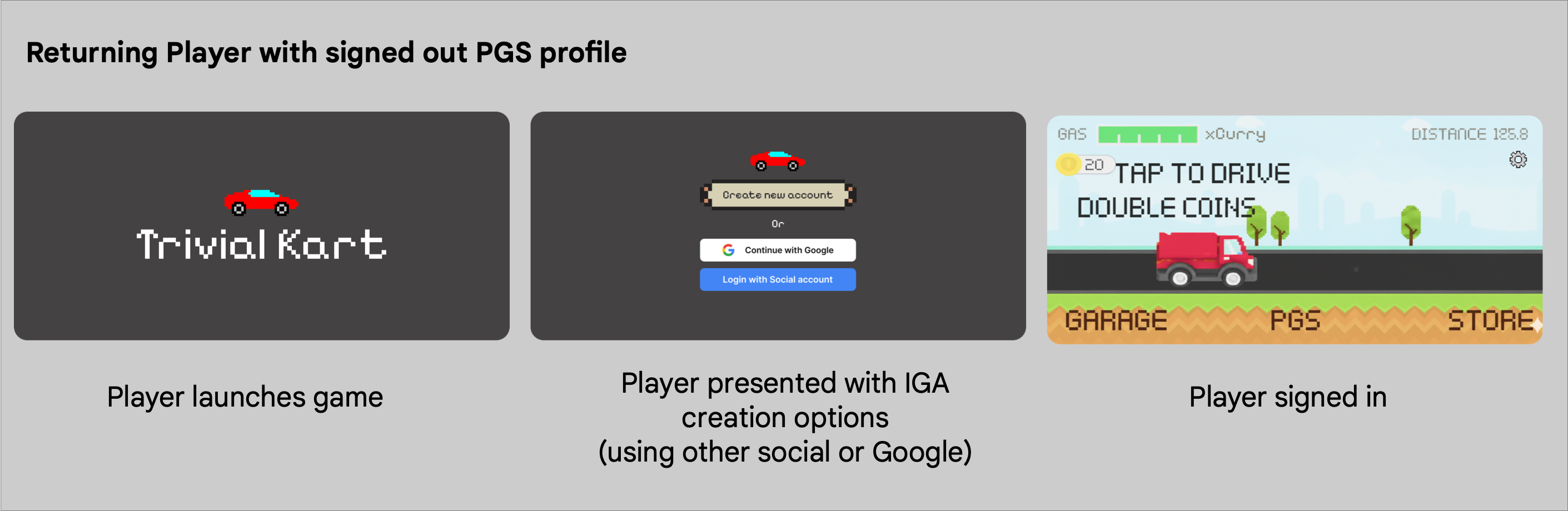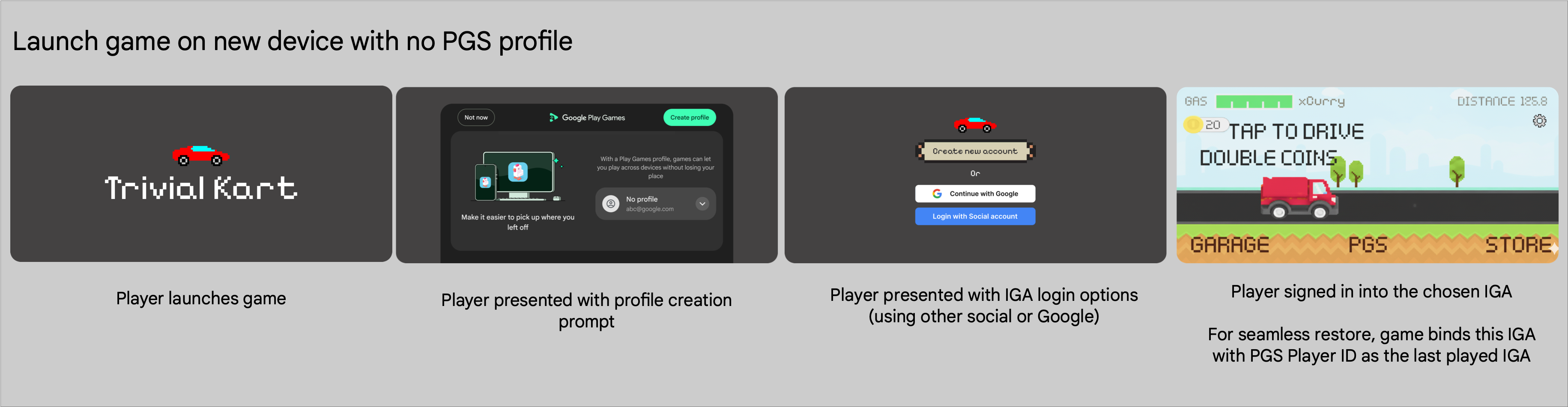 - وقتی بازیکن با یک حساب کاربری IGA متفاوت وارد سیستم میشود، بازی این حساب جدید را به عنوان آخرین حساب کاربری IGA بازی شده به PGS Player ID فعلی متصل میکند تا بازیابی بدون مشکل انجام شود.