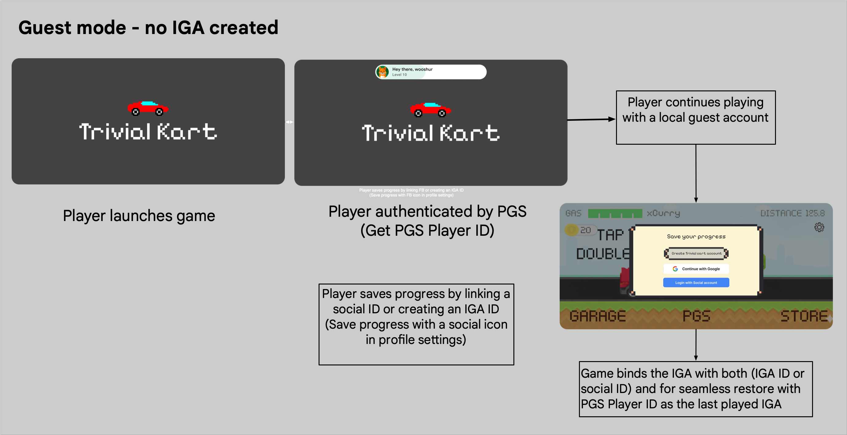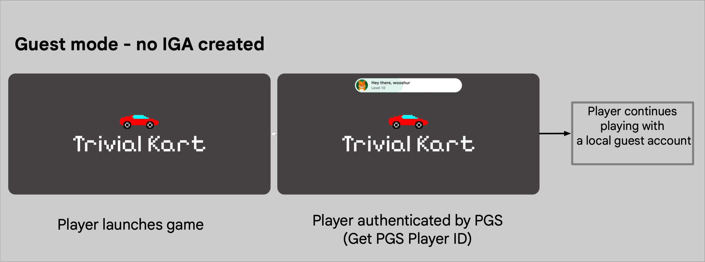 بازیکنان میتوانند بازی را اجرا کرده و با استفاده از یک حساب کاربری مهمان محلی بازی کنند. PGS همچنان در پسزمینه احراز هویت میکند. اگر بازیکن گزینه ذخیره پیشرفت را انتخاب کند، بازی جلسه مهمان را به یک IGA دائمی تبدیل کرده و آن را به شناسه بازیکن PGS متصل میکند.