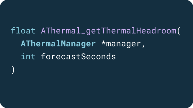 Confira um app de exemplo que mostra o status térmico do dispositivo usando as APIs getThermalHeadroom e Thermal State Monitoring. O app também muda dinamicamente a carga de trabalho com base na dica da API, usando a API PerformanceHintManager para controlar o desempenho da linha de execução de renderização.