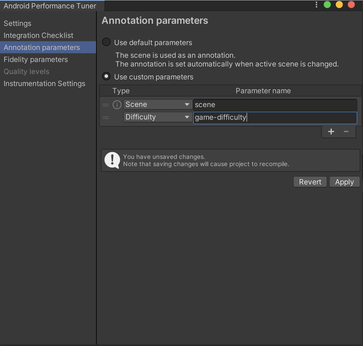 These parameters can be regrouped into quality levels (for example "low", "medium", and "high"). To have these parameters properly reported by Android Performance Tuner, and then analyzed and visualized in the Google Play Console, you must expose the parameters to the plugin. Add your fidelity parameters in the Fidelity parameters tab.