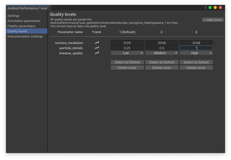 Fidelity parameters reflect the performance and graphical settings of your game. Quality levels are used to annotate sessions so that you can determine if devices are running on a quality level that is too high (resulting in lower performance) or too low (resulting in unnecessarily reduced fidelity).