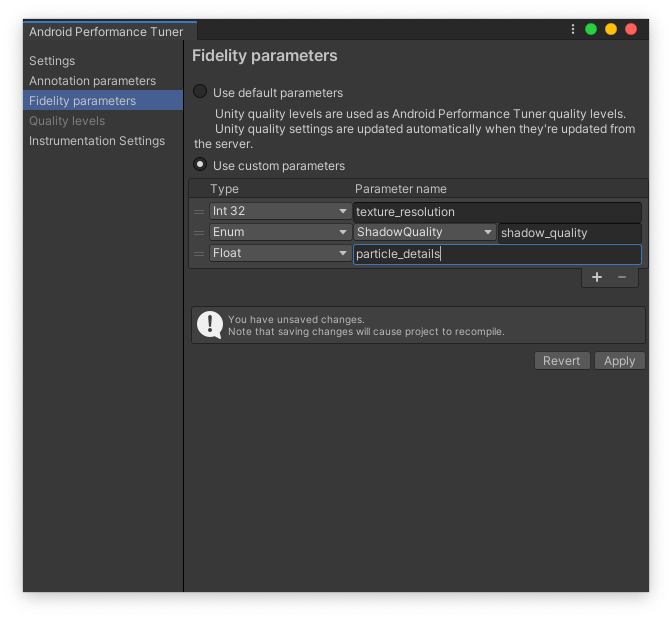 Ces paramètres peuvent être regroupés en niveaux de qualité (par exemple, "Faible", "Moyen" et "Élevé"). Pour que ces paramètres soient correctement signalés par Android Performance Tuner, puis analysés et visualisés dans la Google Play Console, vous devez les mettre à la disposition du plug-in. Ajoutez vos paramètres de fidélité dans l'onglet Fidelity parameters (Paramètres de fidélité).