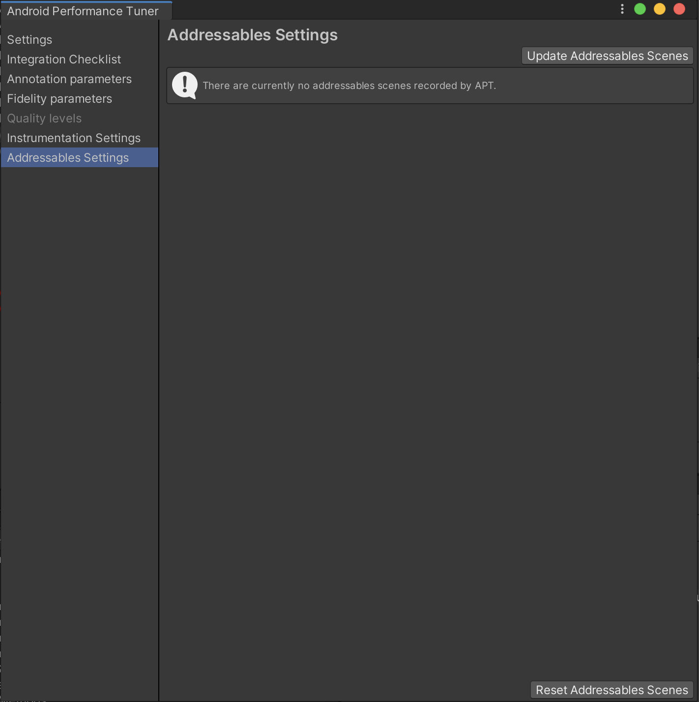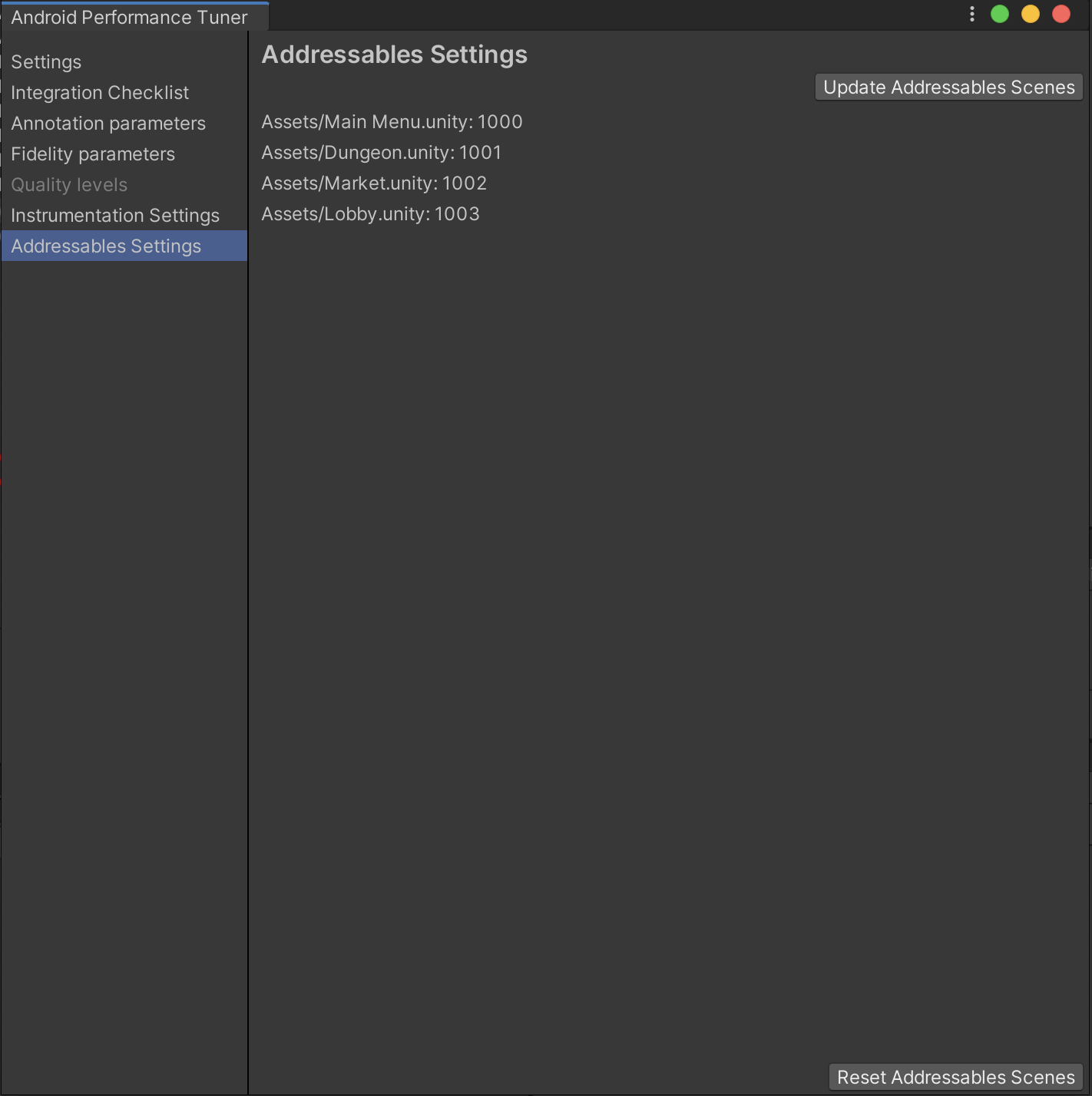 En esta página, se describe la configuración de Android Performance Tuner para incluir escenas Addressable en Unity.