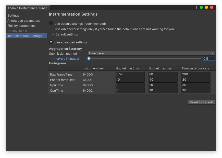 ช่วงเวลาเริ่มต้นระหว่างการอัปโหลดข้อมูลการวัดและส่งในส่วนการตั้งค่าปลั๊กอินคือ 30 วินาที โดยจะตั้งค่าช่วงเวลานี้เป็นช่วงเวลาสั้นๆ เพื่อให้ยืนยันการอัปโหลดการวัดและส่งข้อมูลทางไกลได้อย่างง่ายดาย เมื่อเผยแพร่เกมไปยังเวอร์ชันที่ใช้งานจริง ให้ตั้งค่านี้เป็นช่วงเวลาที่นาน (เช่น ทุกๆ 10 นาที) เพื่อไม่ให้เกมส่งคำขอไปยัง API มากเกินไป ซึ่งเป็นสิ่งสำคัญอย่างยิ่งสำหรับผู้ใช้ที่ไม่มีแพ็กเกจอินเทอร์เน็ตบนอุปกรณ์เคลื่อนที่แบบไม่จำกัด นอกจากนี้ ช่วงเวลาที่ยาวนานยังช่วยหลีกเลี่ยงการใช้แบตเตอรี่ของอุปกรณ์มากเกินไปอีกด้วย