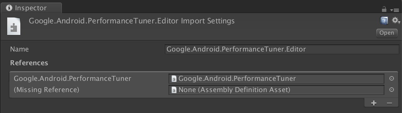 圖 1. 缺少的組合參照。前往「Assets/AndroidPerformanceTuner/Runtime」資料夾。