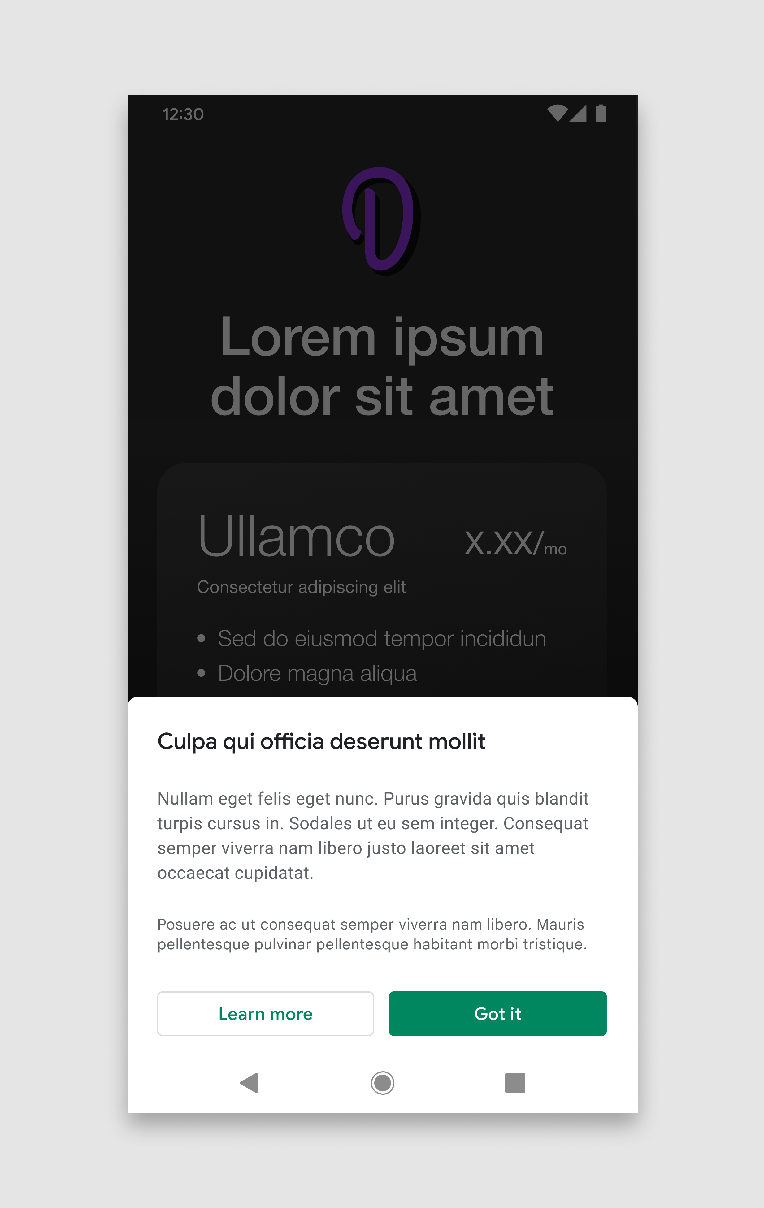 নীচের শীটটি অবশ্যই ট্রিগার করা উচিত যখন কোনও ব্যবহারকারী আপনার অ্যাপের একটি বোতাম বা অন্যান্য UI উপাদানে ট্যাপ করে যা একটি ক্রয় শুরু করে। ব্যবহারকারী তথ্য স্ক্রীন থেকে দুটি সম্ভাব্য পদক্ষেপ নিতে পারে: