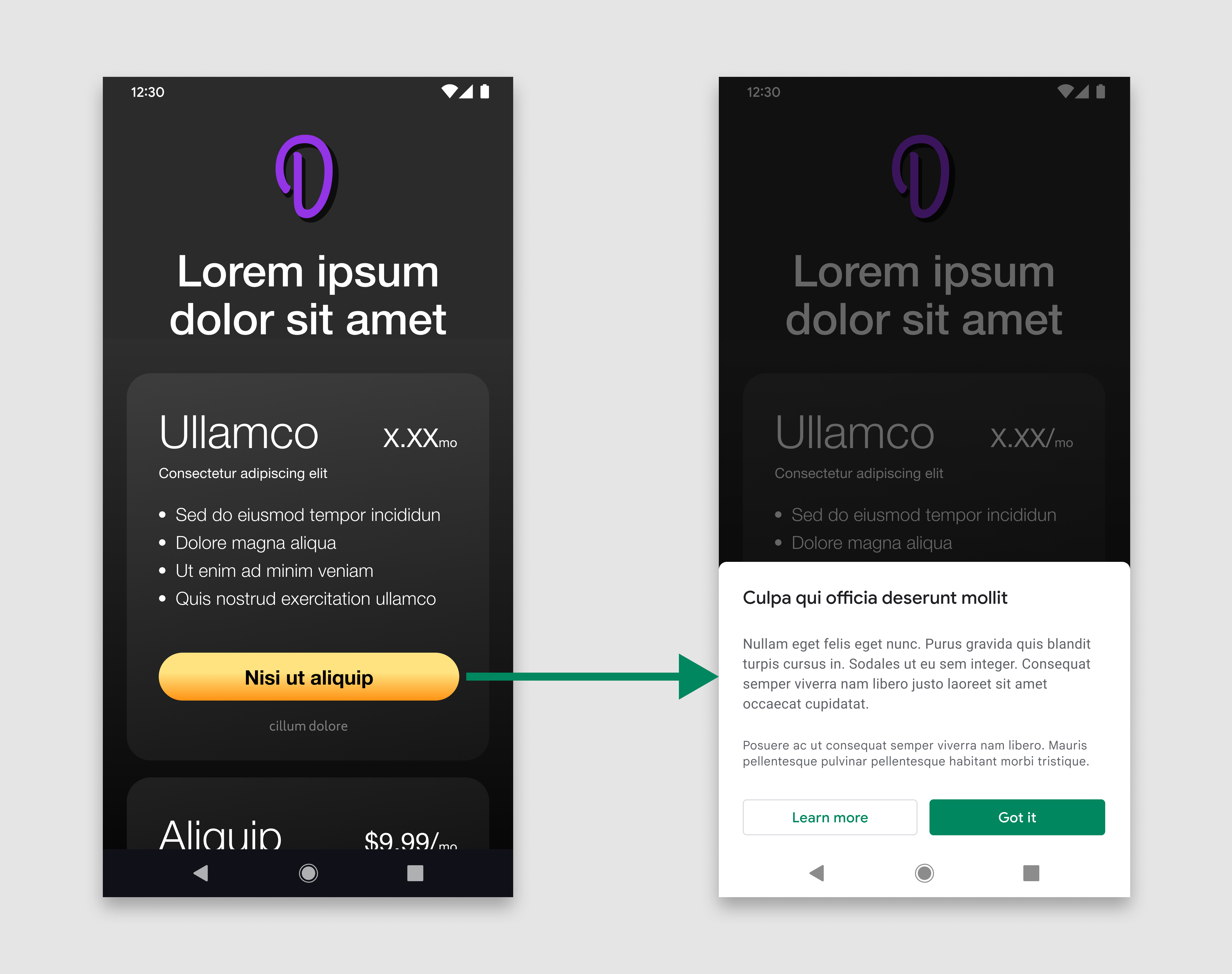 Die Ansicht am unteren Rand muss ausgelöst werden, wenn ein Nutzer auf eine Schaltfläche oder ein anderes UI-Element in deiner App tippt, um einen Kauf zu starten. Auf dem Informationsbildschirm können Nutzende zwei mögliche Aktionen ausführen: