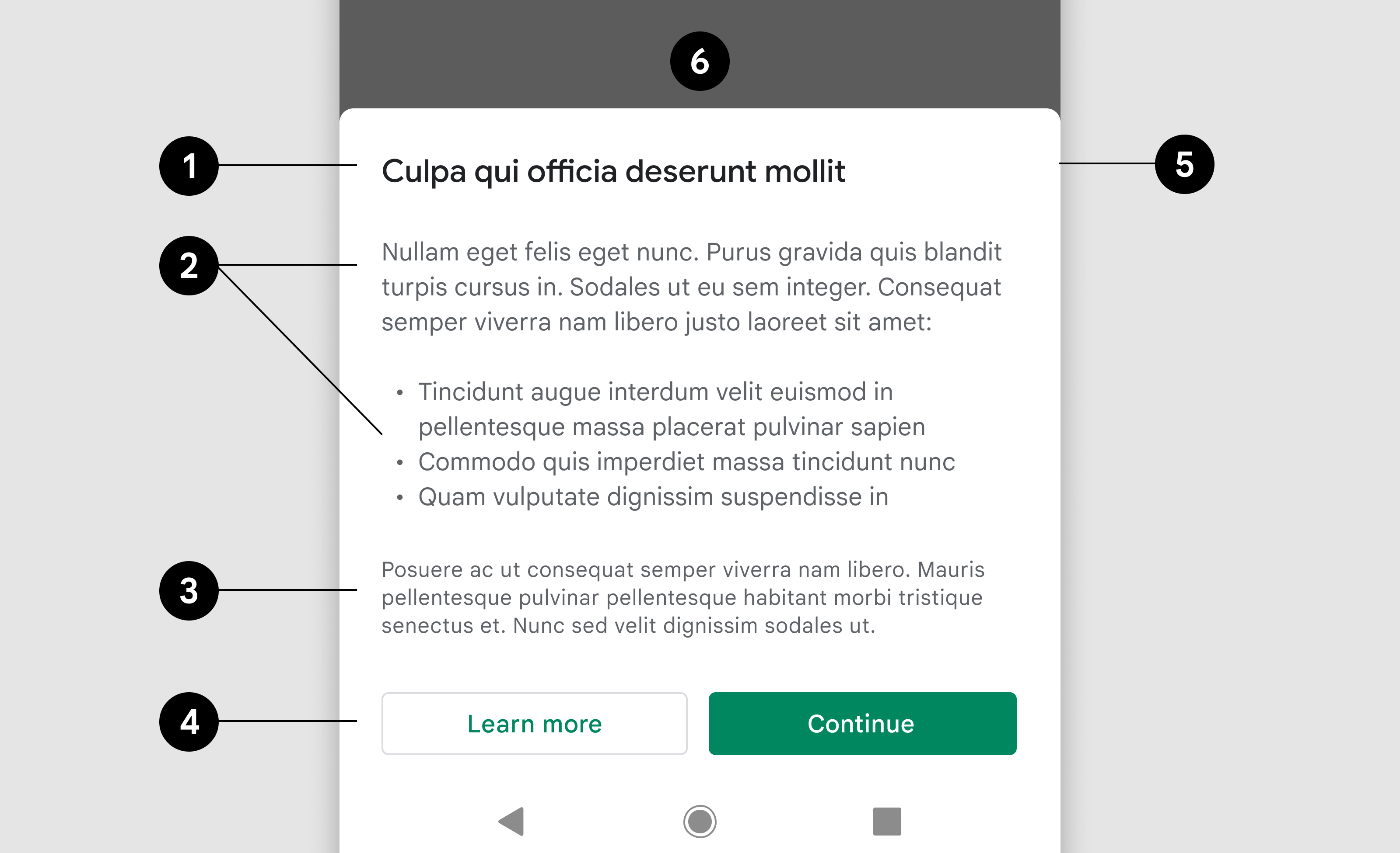 تنقسم شاشة المعلومات إلى ثلاثة مكوّنات: العنوان والرسالة والأزرار. يجب توفُّر جميع المكوّنات الثلاثة، ويجب أن تتضمّن النص وعناصر واجهة المستخدم المحدّدة في هذه الإرشادات. لا تضِف أي نصوص أو صور إضافية على هذه الشاشة، ولكن يمكنك إضافة نصوص وصور إضافية على شاشات أخرى.