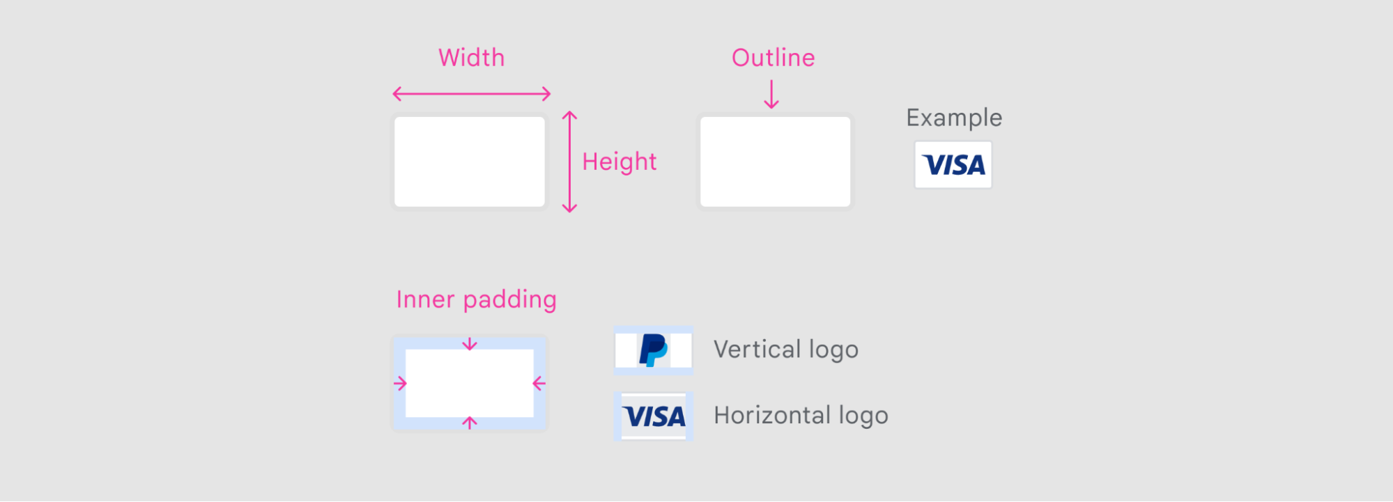 يجب أن تتّبع بطاقات طريقة الدفع المضمّنة في مادة عرض الصورة الإرشادات التالية بشأن الحجم والتباعد والشكل.