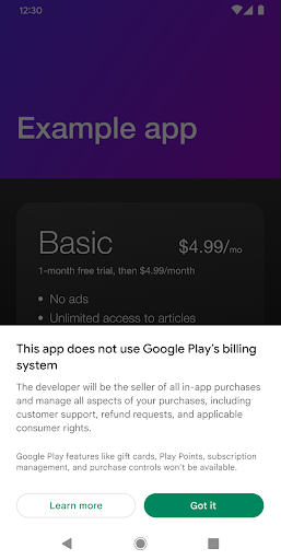 La schermata informativa aiuta gli utenti a capire che all'interno dell'app idonea viene offerto solo un sistema di fatturazione alternativo. La schermata informativa verrà mostrata agli utenti all'inizio del primo acquisto nell'app dopo l'attivazione della fatturazione alternativa. Questo messaggio non verrà visualizzato negli acquisti successivi effettuati dallo stesso utente nella tua app sullo stesso dispositivo. Tieni presente che la finestra di dialogo potrebbe essere mostrata di nuovo a un utente in situazioni come la cancellazione delle cache sul dispositivo.