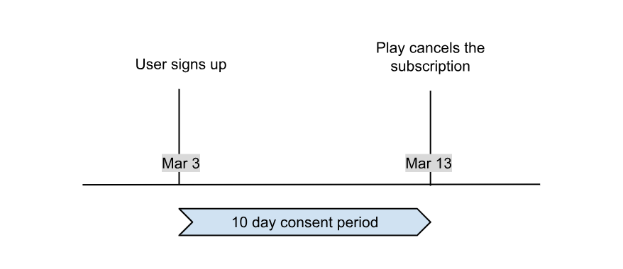 3 月 3 日に、韓国のユーザーが 10 日間の無料トライアル期間付きで定期購入に登録します。ユーザーが登録時に価格のステップアップに同意します。このシナリオでは、Google Play は 3 月 13 日に価格の引き上げを適用します。