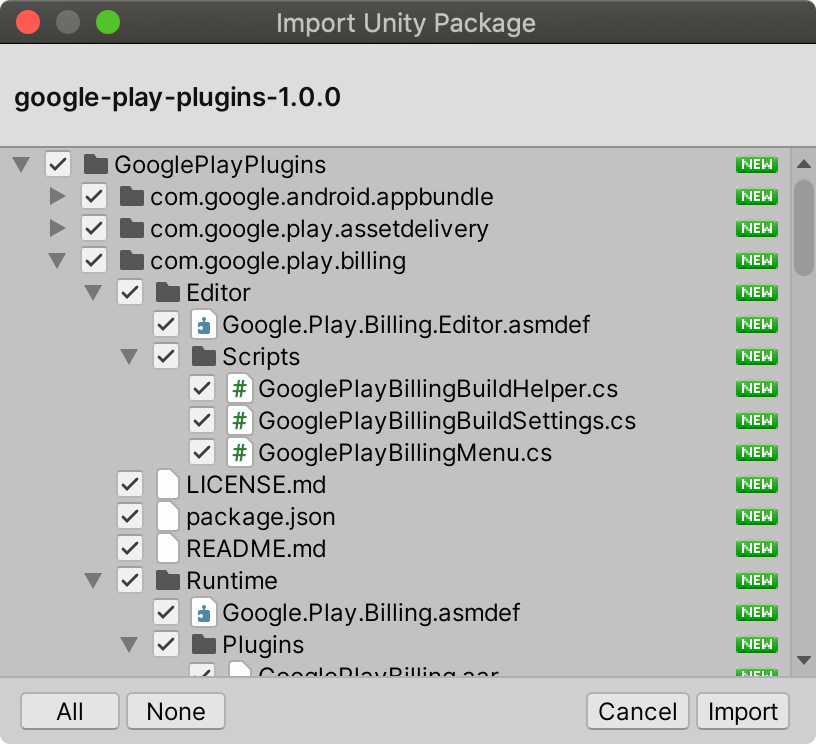 After the package imports, a new folder called GooglePlayPlugins (at the root of the Assets folder) is added to your project's assets. This folder contains all of the Google Play Billing Library assets for the plugin.