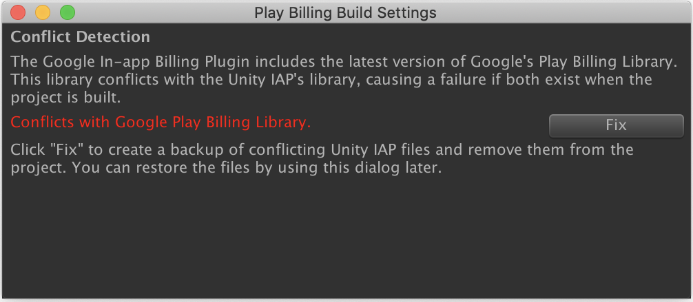 In the Play Billing Build Settings window, click Fix. This resolves the conflict and moves the conflicting Unity IAP files to a backup directory. After you click Fix, the button changes to Restore, which you can click to restore the original, conflicting files.