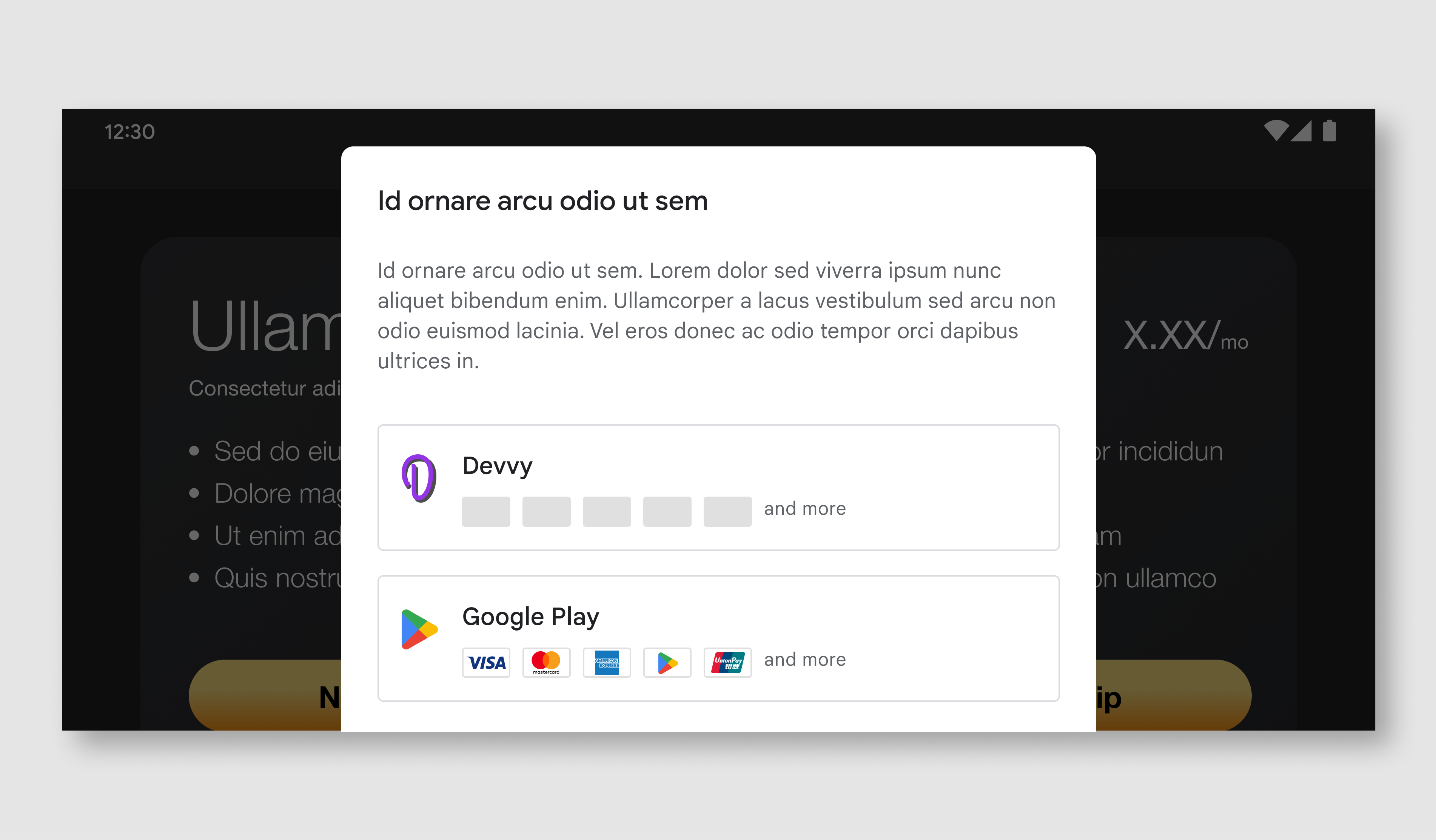 โปรแกรมนำร่องการเรียกเก็บเงินแบบให้ผู้ใช้ตัดสินใจ ช่วยให้นักพัฒนาแอปที่เข้าร่วมทดสอบการเสนอตัวเลือกการเรียกเก็บเงินระบบอื่น ข้างๆ ระบบการเรียกเก็บเงินของ Google Play และออกแบบมาเพื่อช่วยให้เราสำรวจการเสนอ ตัวเลือกนี้ให้แก่ผู้ใช้ หลักเกณฑ์ UX เหล่านี้มีจุดมุ่งหมายเพื่อรักษาประสบการณ์ของผู้ใช้ให้สอดคล้องกันและช่วยให้ผู้ใช้มีข้อมูลประกอบการตัดสินใจ