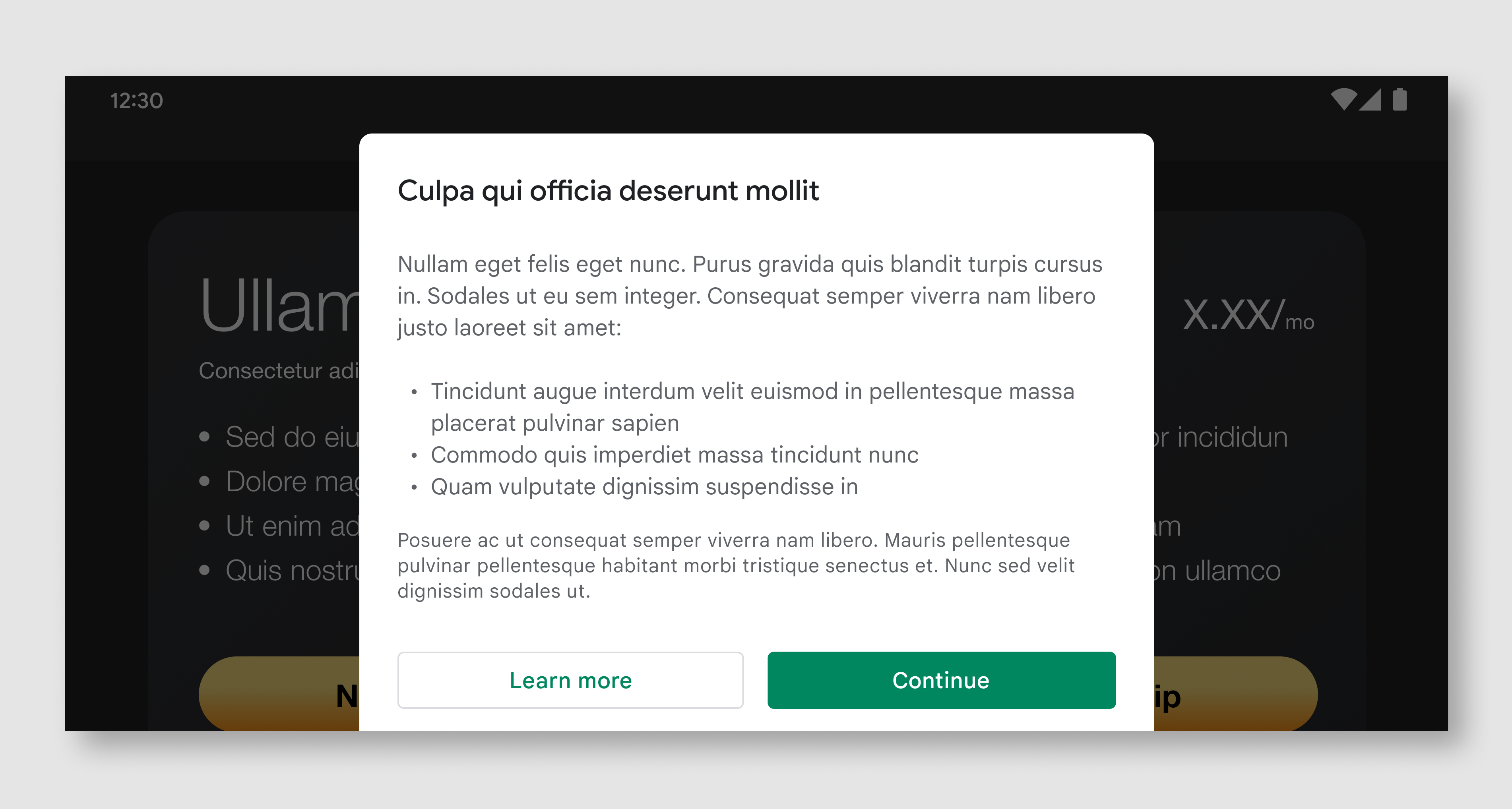 คุณต้องแสดงหน้าจอข้อมูลและหน้าจอตัวเลือกการเรียกเก็บเงินแยกต่างหาก หากเข้าร่วมโปรแกรมนำร่อง หน้าจอข้อมูลจะต้องแสดงต่อผู้ใช้แต่ละรายเฉพาะครั้งแรกที่ผู้ใช้เริ่มการซื้อเท่านั้น ส่วนหน้าจอตัวเลือกการเรียกเก็บเงินจะต้องแสดงก่อนการซื้อทุกครั้ง ข้อความที่แสดงต่อผู้ใช้ และข้อกำหนด UI สำหรับทั้ง 2 หน้าจอต้องได้รับการติดตั้งใช้งานตาม หลักเกณฑ์ต่อไปนี้