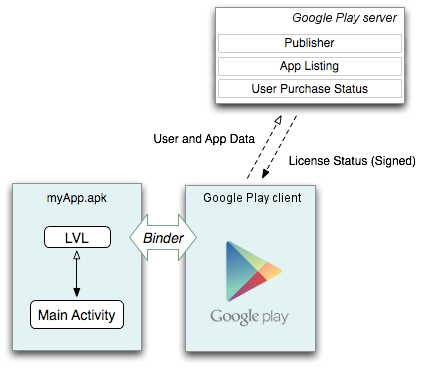 O SDK do Android fornece o download de um pacote chamado Google Market Licensing, que inclui a License Verification Library (LVL, na sigla em inglês). A LVL simplifica muito o processo de adição do licenciamento ao app e ajuda a garantir uma implementação mais segura e robusta do seu app. A LVL fornece classes internas que processam a maioria das operações padrão de uma consulta de licença, como entrar em contato com o cliente do Google Play para iniciar uma solicitação de licença, e verificar e validar as respostas. Ela também expõe interfaces que permitem que você insira facilmente códigos personalizados para definir a política de licenciamento e gerenciar o acesso conforme necessário. As principais interfaces da LVL são: