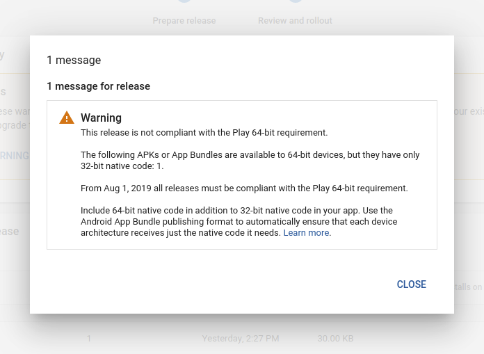 Play Console also shows warnings that apply to your draft releases if there are any issues related to the 64-bit requirement. The following image is an example.